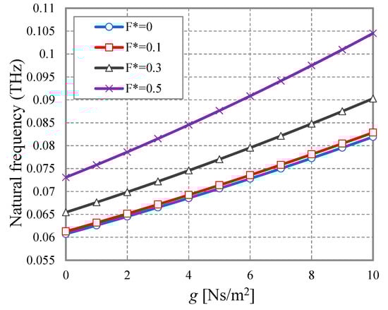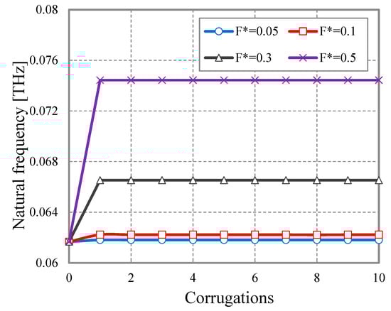 A complete overview of the vibrating response of the corrugated nanosheet with varying geometries is plotted in Figure 3 and Figure 4. More specifically, a different number of waves is considered in Figure 3, while varying the amplitude between and . As visible in Figure 3, an increasing wave amplitude , for a fixed number of corrugations, leads to an increased frequency and stiffness of the nanoplate. The natural frequency seems to increase linearly up to a threshold value, moving from a flat to a corrugated nanoplate with just one corrugation. This threshold value clearly depends on the corrugation, since it increases for increasing magnitudes . A meaningless increase of the natural frequencies is also observed in Figure 3 after 1 corrugation, probably because further corrugations do not affect significantly the stiffness of the structure. Figure 4 also shows the effect of the damping on the structural response of a corrugated nanoplate with , nm2, , where the natural frequency of the structure increases proportionally with the viscoelastic damping. This increase is even more pronounced for increasing wave magnitudes . This means that the geometry of corrugations can affect the response of the nanostructure significantly, especially for higher values of viscosity. Thus, the exact geometry of wrinkles and imperfections resulting from a manufacturing process must carefully account for the structural study of a hyper-viscoelastic nanoplate.