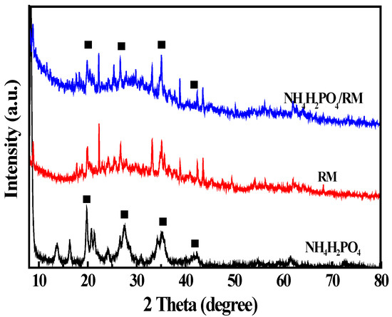 X-ray diffraction (XRD) patterns of NH4H2PO4/RM composite powders, red mud (RM), and NH4H2PO4.