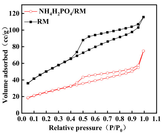 The N2 adsorption-desorption isotherms of red mud and the NH4H2PO4/RM composite powders are shown in Figure 4. Both of the isotherms are type IV in the IUPAC classification with the H4 hysteresis loop. The results indicate that these two powders possess the mesoporous structure, and capillary condensation occurred during the adsorption-desorption process. After loading the NH4H2PO4 particles, the adsorption capacity of the composite is lower than red mud in the P/P0 range of 0.5–1.0, indicating the decrease of mesopores in the NH4H2PO4/RM composite powders and the formation of a granulation structure during the loading process. The data of this experiment confirmed the changes of the NH4H2PO4/RM morphology that are presented in SEM images (Figure 3). The specific surface area and pore volume of red mud are 123.16 m2·g‒1 and 0.158 cm3·g‒1. After loading the NH4H2PO4 particles, the data of the composite powders are reduced to 75.83 m2·g‒1 and 0.116 cm3·g‒1. It means that the NH4H2PO4 particles were loaded on the surface and/or in the pore of red mud.