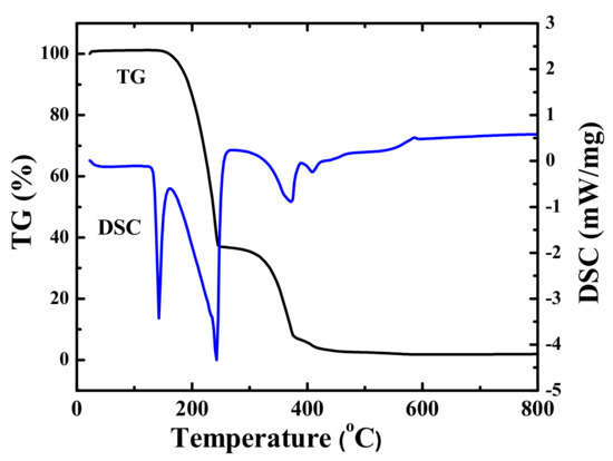 The TG-DSC curves of the NH4H2PO4/RM composite powders are shown in Figure 5. From the TG curve, there are three weight loss stages in the whole process. The first stage from 120 °C to 220 °C is attributed to the lost and the thermal decomposition of adsorbed and intercalated moisture of the NH4H2PO4/RM composite powders. The second stage from 220 °C to 300 °C could be ascribed to the decomposition of NH4H2PO4. The third stage from 300 °C to 420 °C could be ascribed to the decomposition of the hydroxides (such as: Al(OH)3 and Fe(OH)3). After 420 °C, there is no further weight loss, indicating that the composite powder became stable. The total weight loss of the NH4H2PO4/RM composite powders is 93.7%. The DSC curve of the composite powders exhibited three endothermic peaks, which is consistent with the TG curve. According to the DSC curve, the total endothermic quantity of the NH4H2PO4/RM composite powders is 1257.9 J·g−1, indicating that the composite powders presented an excellent heat absorption performance.
