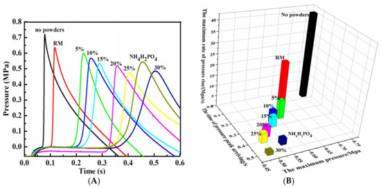 The suppression effect of NH4H2PO4/RM composite powders: the explosion pressure curves (A), the maximum pressure, the maximum rate of pressure rise, and the time of pressure peak arriving (B).