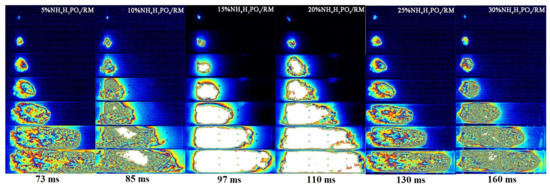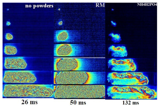 The flame propagation images of the 9.5% premixed methane-air explosion with the red mud, NH4H2PO4, and the NH4H2PO4/RM composite powders are shown in Figure 7. As shown in this figure, the time of explosion flame propagating to the top of the pipe is 26 ms with no powders addition. When the pure red mud or the NH4H2PO4 powders was added, the time is 50 ms and 132 ms, respectively. When the NH4H2PO4/RM composite powders with the different amount of NH4H2PO4 (5%, 10%, 15%, 20%, 25%, and 30%) were added, the time of explosion flame reached the top are 73 ms, 85 ms, 97 ms, 110 ms, 130 ms, and 160 ms, respectively. The results indicate that the NH4H2PO4/RM composite powders present a much better suppression effect on flame propagation speed than that of pure RM powders. In addition, the 30%-NH4H2PO4/RM composite powders exhibit the best inhibition performance, which is consistent with the results that were tested by the 20 L spherical explosive system.