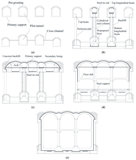 Subway station by the pile-beam-arch method: (a) Pilot tunnels construction, (b) Perfusion pile construction, (c) Arch construction, (d) Floor slab construction, (e) Completed construction.