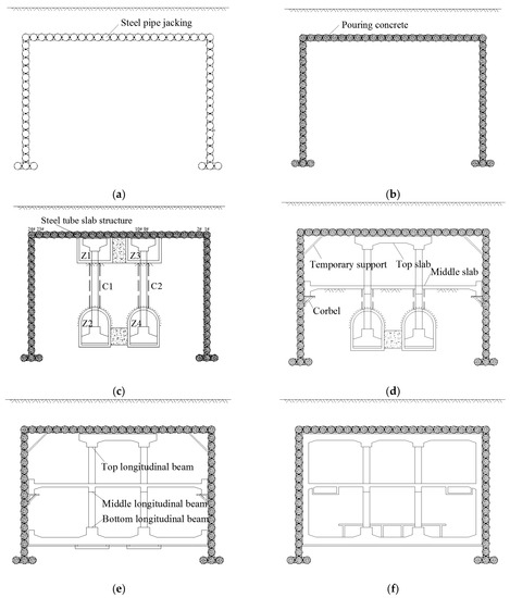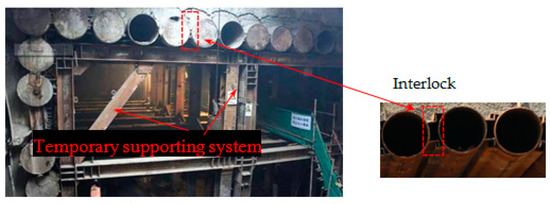 Another approach used for underground supporting system is traditional pipe roofing method. In this technique, adjacent steel tubes are connected by interlock to form the pipe roofing structure, and then temporary supports are established while the soil below the pipe roofing is excavated. Previous applications of this method show that it is effective in reducing surface deformation [25,26]. However, in this technique, adjacent steel tubes are only connected by interlock, resulting in low lateral stiffness of the pipe-roof structure. As a result, other temporary supports must be established to maintain the stability of the whole structure when the soil is excavated, increasing the construction complexity and cost, as shown in Figure 2.