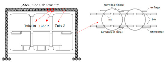 (2) Lateral connecting bolts are installed between adjacent steel tubes by artificial operations. Blocking plate at both ends of the steel tubes are then installed, and concrete is poured through grouting holes on the blocking plates (Figure 6b).