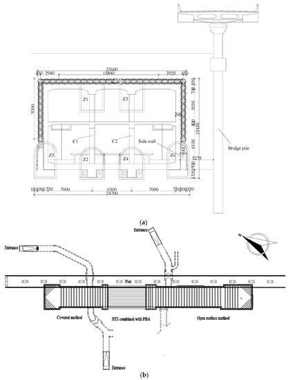 The total length and standard cross section of the subway station is 225.95 m and 24.7 m, respectively. And the buried depth of the bottom floor of the platform layer is approximate 17.5 m, with an overburden layer of about 3.4 m thick. For the construction, the station is divided into three sections: north of the station for which covered excavation is used; south of the station for which open surface method is adopted; and the middle section of the station for which a combination of STS and PBA methods is adopted due to the intensity of the surrounding structures and heavy surface traffic load. The length of the southern, middle, and the northern segments of the station are 68.65 m, 114.4 m, 42.9 m, respectively. The engineering details of the Northeastern Street station is shown in Figure 4.