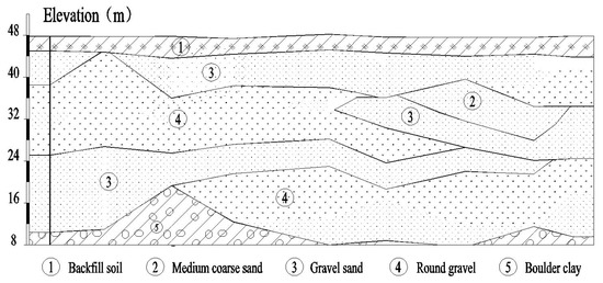 The soil stratigraphy at the station location was determined from geological and geotechnical investigations. Accordingly, the soil deposit can be divided into five layers based on the mechanical properties and formation lithology, as shown in Figure 5. And depth of the water table is from 5.2 m to 14.9 m in the construction area. In order to get the strength parameters of sandy soils, a series of super heavy Dynamic cone Penetration test (DPSH) were performed, as shown in Table 1.