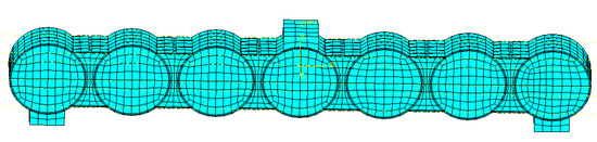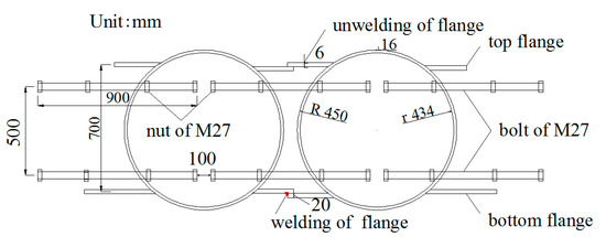 For the Northeastern Street station, the design specifications required the outer diameter and the thickness of the steel tubes of 0.9 m and 16 mm, respectively, and the center distance between two adjacent steel tubes of 1.0 m. Adjacent steel tubes are connected by horizontal straight bolts with a diameter of 32.0 mm, bottom flanges with a width of 200 mm and a thickness of 22 mm, and concrete with a strength grade of C30. There are two rows of horizontal bolts (top and bottom) which are 0.15 m apart in the longitudinal direction. The adjacent overlapped flanges are welded, and concrete is poured in the steel tubes, and in the space between them. Connection of adjacent steel tubes is shown in Figure 7.