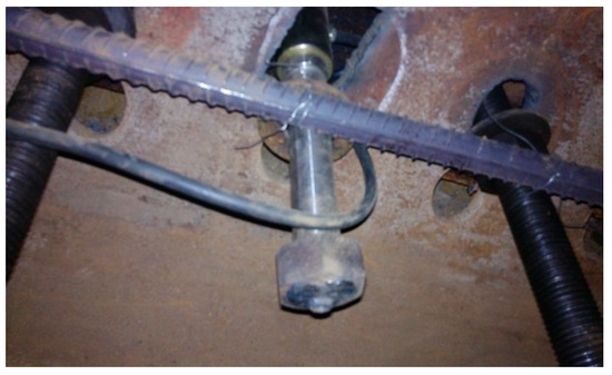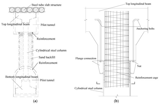 The bottom and top longitudinal beams are made of C40 concrete, which are directly poured in place, in connection with the cylindrical steel columns. Sand is poured into the space between the cylindrical steel columns and the surrounding soil to increase the stability of the cylindrical steel columns (see Figure 8a). The cylindrical steel columns and longitudinal beams are connected by a reinforcement cage, which is adopted in the cylindrical columns. Furthermore, flanges are used to provide further strength in the connection between longitudinal beam and cylindrical column, as shown in Figure 8b. Besides, anchoring bolts are lengthened and bent at the ends to increase anchorage force.