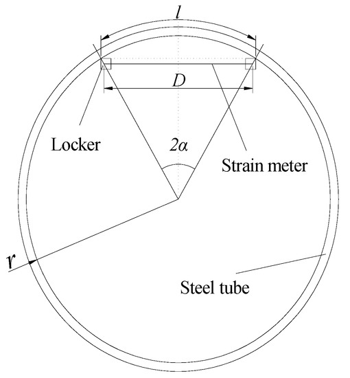 Considering circumferential strain meters merely measure the chord length corresponding to a circular arc of inner wall of steel tubes, in order to analyze the measurement error of circumferential strain, the feasibility and accuracy of monitoring schedule is investigated. Based on the installation in Figure 10, the chord length and in corresponding to ach length are D and l, respectively, and central angle and the inner radius are 2α and r. In the jacking stage, the strain of chord length is εD, and the circumferential deformation and strain are Δl and εr. So, the relative error is calculated based on the Formula 1 [30].