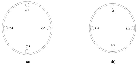Diagram of strain measuring points: (a) Circumferential strain meter; (b) Longitudinal strain meter.