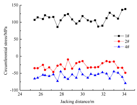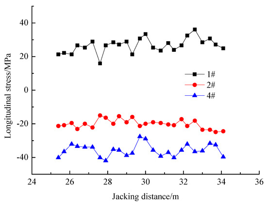 The longitudinal and circumferential stress are shown in Figure 12 and Figure 13, along with the increase of the jacking distance in the construction stage. Based on the monitoring results, the stress trend of section A is similar to section B. The results are thus analyzed according to section A. As point 3 is damaged in the construction stage, it is not analyzed.