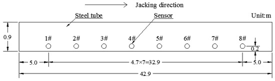 In order to study the force behavior and the force differences between different jacking distance in the jacking construction, the two monitoring sections A and B are arranged in Steel tube 5#, and the distance from the initial end are 9 m and 15 m, respectively. Four monitoring points are prepared in every section, and each point is installed two strain meters, one longitudinal direction and one circumferential direction. The point above the steel tube is defined as 1#, and the others point are defined as 2#, 3# and 4# according to a clockwise direction, as shown in Figure 11.