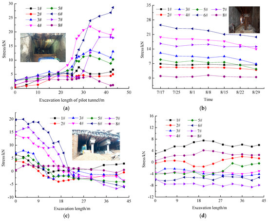The stress on the bolts connecting Tube 9 and Tube 10 were monitored during the construction sequence of the station. The stresses recorded in the eight monitoring sensors at different construction stages are shown in Figure 16. The following observations can be made at different construction stages: