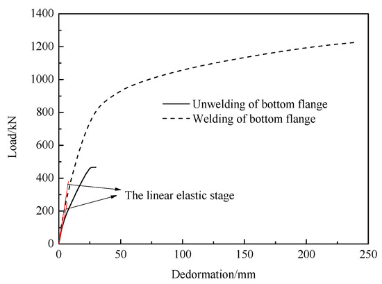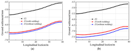 The settlement profile for the crown of Z1 and Z2 tunnels, and after the bottom (Z2) is completed, the ground with and without welding of the flanges are shown in Figure 31 and Figure 32 for the section at y = 15 m. The ground settlement above the pilot tunnel Z1 increases around 1.3 mm with the welding of flanges during the excavation, and the ground settlement increases 1.35 mm without welding of the flange, increasing 5.47%. The crown settlement of the pilot tunnel Z1 also shows only a slight decrease (from 2.1 mm to 1.9 mm) when flanges are welded. It can be concluded that the welding of flanges during the excavation of the upper pilot tunnel Z1 has little impact on the settlement of the whole structure.