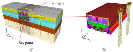 Settlement profiles at a section with y = 15 m: (a) Ground settlement; (b) Vertical deformation of horizontal section of the STS structure.
