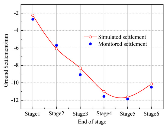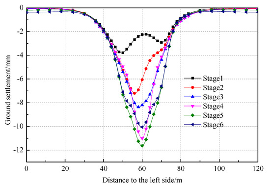 End of stage 5: The cumulative ground settlement is 11.6 mm, and the ground settlement increases 0.52 mm which accounts for 5.16% of the maximum ground settlement. The whole force bearing system is completed in this step, thus, the construction of the station hall has a little impact on total ground settlement.