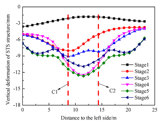 The stability of the STS structure directly influences the safety of the whole construction. Therefore, deformation of the STS structure in different excavation stages is discussed in the following.