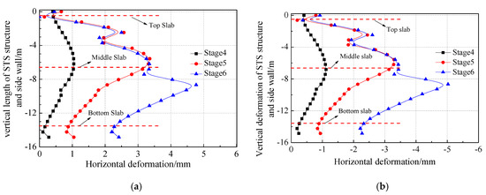 Horizontal displacement profile of vertical sections of the STS structure and the side walls: (a) Left vertical section of STS structure and left side wall; (b) Right vertical section of STS structure and right-side wall.