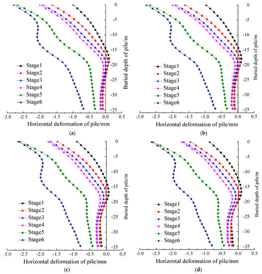 The horizontal deformation of bridge piles after each construction stage: (a) Bridge pile1; (b) Bridge pile 2; (c) Bridge pile 3; (d) Bridge pile 4.