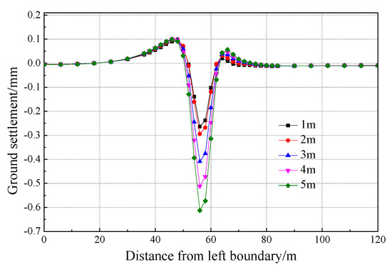 In this section, the effect of different step lengths on the ground settlement and crown settlement at cross section with y = 20 m is investigated through the numerical simulations, and the ground settlement profile and crown settlement profile are showed in Figure 34 and Figure 35.
