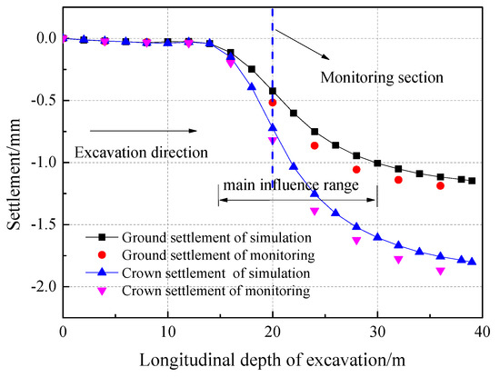 As for the ground and the crown of the pilot tunnel, the simulation and monitoring value show similar settlement profiles when pilot tunnel Z1 is excavated, and the largest difference of both is within 10%, as shown in Figure 36. The maximum settlement of ground is no more than 1.25 mm, and the crown settlement is less than 2.0 mm. Settlements are noticeable only for sections that are more than 15 m away from the initial face of the tunnel, and the settlement tends to be a constant when the excavation face exceeds the longitudinal length of 30 m. So, the main influence range is before 5 m and after 10 m of the monitoring section in settlement.