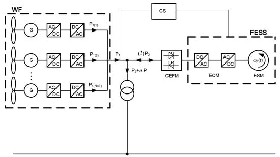 Figure 1 presents a schematic diagram of a wind farm cooperating with a global (common for all turbines) storage of kinetic type. The power generated in each turbine P1(i)(t) (for i = 1, 2, …, NWT, where NWT is the number of turbines in the farm) is supplied to a node and then—depending on the instantaneous power of farm P1 and the state of charge (SOC) of the ESS—to storage P2 and/or power grid P3. The storage can also operate with power P2 when discharged, and then the stored energy is supplied to the power grid. The (+) sign of power P2 means that the storage is discharged, while (−) stands for its charged conditions. Power P3 is supplied to the power grid. The power is the sum of the power of the turbines and the storage, reduced by the ΔP power loss in the transformer and the line supplying power to the grid: