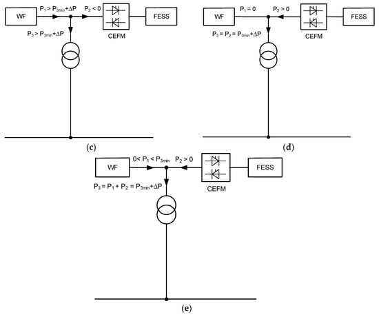 Power flow in the wind turbine (WT)-FESS system for different system operating conditions: (a,b) independent operation of a wind farm; (c) storage charging; (d) independent operation of the storage (discharging); (e) simultaneous operation of a wind farm and a storage system (P3′—output power of the system considering power losses ΔP in the transformer and the line).