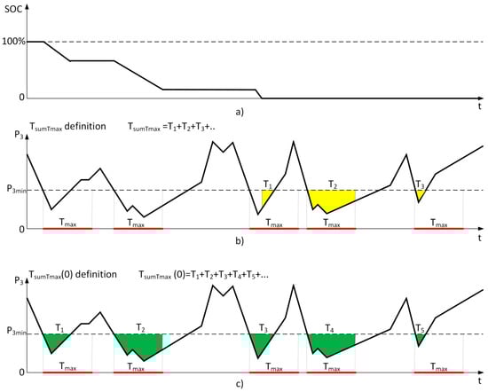 Figure 5. The diagram presenting the difference between Tmax, TsumTmax and TsumTmax(0): (a) FESS’s state of charge; (b) process of output power changes P3 with marked periods shorter than Tmax, in which the system does not provide minimum power P3min; (c) process of changes in output power P3 with marked periods shorter than Tmax, in which the system does not provide minimum power P3min. - power deficit accounting only for periods lasting up to Tmax:where: P3avg(i) is the mean power supplied to the grid from the wind farm—kinetic energy storage system in the ith interval shorter than or equal to Tmax, in which the power released to the grid P3 is lower than the assumed minimum power P3min.