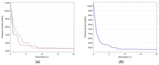 Changes in the value of the function of the best individual’s adaptation as a function of the generation number for a farm power PWFn(1) = 10 MW, power P3min(2) = 20%PWFn = 2 MW, Tmax(3) = 25 min and TsumTmax(1) = 75 h: (a) for five activations of the genetic algorithm; (b) mean value from ten activations of the genetic algorithm.