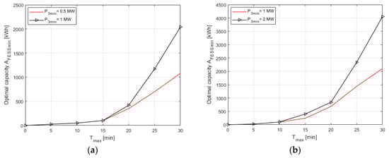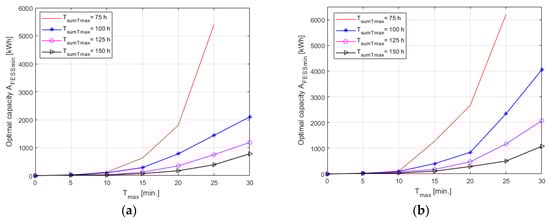 Changes in the minimum (optimum) capacity of the kinetic storage unit AFESSmin in the function of time TsumTmax for: (a) Tmax(3) = 15 min; (b) Tmax(5) = 25 min.