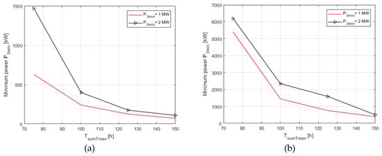 Figure 7 presents the results of optimisation calculations as changes in the minimum capacity of a kinetic storagesystem which meets the required parameters of a system controlling the flow of energy between the farm, storage and power grid as a function of time Tmax for two wind farms with power PWFn(1) = 5 MW (Figure 7a) and power PWFn(2) = 10 MW (Figure 7b). In each case, the calculations were made for two minimum power values P3min(1) = 10%PWFn and P3min(2) = 20%PWFn and TsumTmax(1) = 100 h.