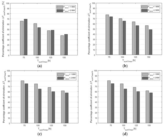 The optimisation of the kinetic energy storage capacity helps to achieve high percentage values of the coefficient of elimination of power generating periods when the power value is below P3min (ΔTsumTmax% − Equation (9)) which amount to 40–80% (mean 53%) of the analysed cases depending on the value of time Tmax and constraint value TsumTmax (Figure 10). The value of the indicator ΔTsumTmax% increased as the system operation constraints become more stringent (shorter times TsumTmax), entailing a significant increase in the required storage capacity. When the value of the constraint time is reduced twice (from TsumTmax = 150 h to TsumTmax = 75 h), the optimised values of the energy storage capacity were 5 to 14 times higher, depending on time Tmax.