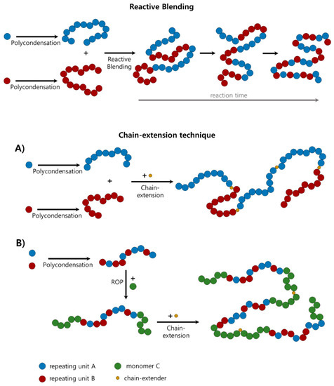 It must be pointed out that reactive blending occurs in the melt at high temperature, therefore the thermal stability of the reacting groups and of the formed chemical bonds may must be taken in due consideration [49]. As a consequence, only a few chemical reactions are suitable for reactive blending, such as interchange reactions between polycondensates [49].