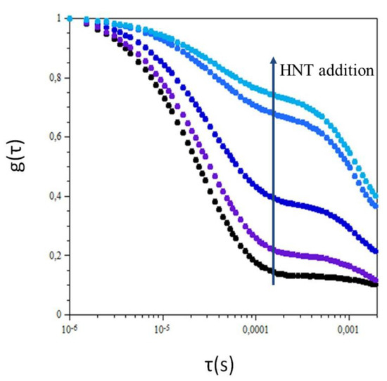 Figure 2 displays the autocorrelation function, g(τ), obtained for the prepared suspensions with various HNT amounts in the microemulsion. A double exponential decay is observed and is correlated to the presence of two particle populations namely, oil in water droplets and HNTs. In particular, the initial decay is associated with fast particles (microemulsion) and as time progresses, the decay is associated with slow particles (HNTs). Typically, the particle volume is the parameter that most affects DLS behavior. We also observed an increase in g(τ) intensity for the second decay as the HNT content increased.