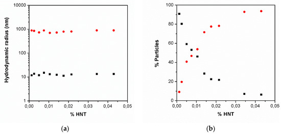 (a) Hydrodynamic radius of HNT (red circles) and microemulsion (black squares). (b) % of particles from DLS intensity for microemulsion (black squares) and HNT (red circles) particles.