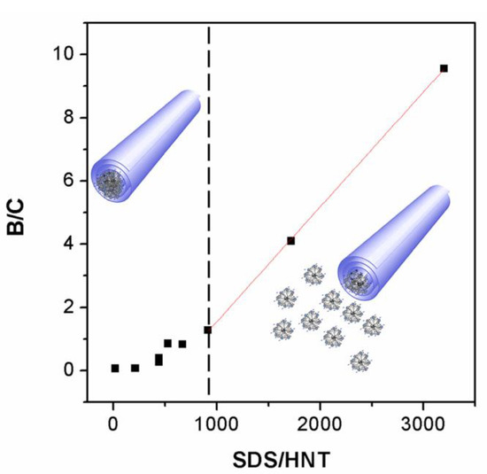 In particular, for RSDS/HNT ≤ 1000 (0.02% of HNT), it is possible to hypothesize the instauration of an equilibrium between micelles dispersed in solution and loaded into the nanotubes. The value of RSDS/HNT = 1000 can be considered as a parameter for the estimation of the saturation limit. In fact, with a higher amount of SDS, the B/C rises linearly as in absence of any interaction.