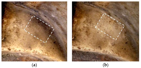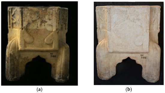 To achieve fine control of the release of the product onto the stone surface, a membrane of PAN nanofibers was used. The presence of PAN nanofibers ensures the absence of direct contact between the HNTs and the stone surface thus avoiding the release of residues on the surface. Moreover, this protocol guarantees a great control of the cleaning area; the part that has first been treated with a soft bristle brush and rinsed with de-ionized water. A first evaluation of the prepared cleaning system is shown in Figure 5, displaying the treated area before and after cleaning. A second examination of the stone surface, by FT-IR, confirmed the removal of the oily layer from the same work of art (spectra are in Supplementary Materials, Figure S1). Figure 6 shows the full view of the Kilga before and after the cleaning treatment.