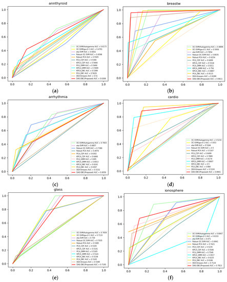 Figure 3 shows the ROC curves of compared 13 methods on 20 different benchmark datasets from ODDS. The DAE-DBC method shows higher AUC scores on 9 of total 20 datasets than other methods. The x-axis is False Positive Rate and the y-axis is True Positive Rate in Figure 3 ROC curves of compared methods.