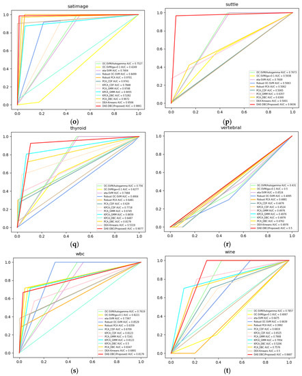 ROC curves of compared methods. (a) Annthyroid, 6 dimension, novelty ratio 0.08; (b) BreastW, 9 dimension, novelty ratio 0.53; (c) Arrhythmia, 274 dimension, novelty ratio 0.17; (d) Cardio, 21 dimension, novelty ratio 0.1; (e) Glass, 9 dimension, novelty ratio 0.04; (f) Ionosphere, 33 dimension, novelty ratio 0.56; (g) Letter, 32 dimension, novelty ratio 0.06; (h) Lympho, 18 dimension, novelty ratio; (i) Mnist, 100 dimension, novelty ratio 0.1; (j) Musk, 72 dimension, novelty ratio; (k) Optdigits, 64 dimension, novelty ratio 0.03; (l) Pendigits, 16 dimension, novelty ratio 0.02; (m) Pima, 8 dimension, novelty ratio 0.5; (n) Satellite, 36 dimension, novelty ratio 0.46; (o) Satimage, 36 dimension, novelty ratio 0.01; (p) Suttle, 9 dimension, novelty ratio 0.07; (q) Thyroid, 6 dimension, novelty ratio 0.02; (r)Vertebral, 6 dimension, novelty ratio 0.14; (s) Wbc, 30 dimension, novelty ratio 0.05; (t) Wine, 13 dimension, novelty ratio 0.08.