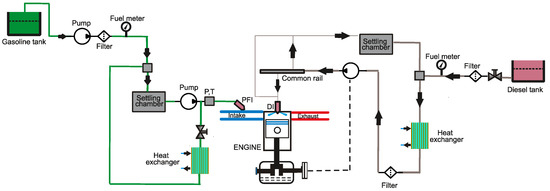 Figure 1 shows the fuel injection systems used for RCCI operation, the main characteristics of which are depicted in Table 2. A centrally located solenoid direct injector (DI) was used to inject the EN590 diesel fuel into the cylinder. The fuel was supplied to the injector by means of a common-rail fuel injection system. A DRIVVEN controller was used to manage the different injection parameters. The gasoline fuel was injected into the intake manifold by means of a port fuel injection (PFI) governed through a Genotec unit. The PFI was located 160 mm from the intake valves to avoid pooling of the fuel. The mass flow rate of both fuels was measured using dedicated AVL 733S fuel balances (AVL LIST GmbH, Graz, Styria, Austria). Table 3 summarizes the main properties of the diesel and gasoline fuels used in this work.