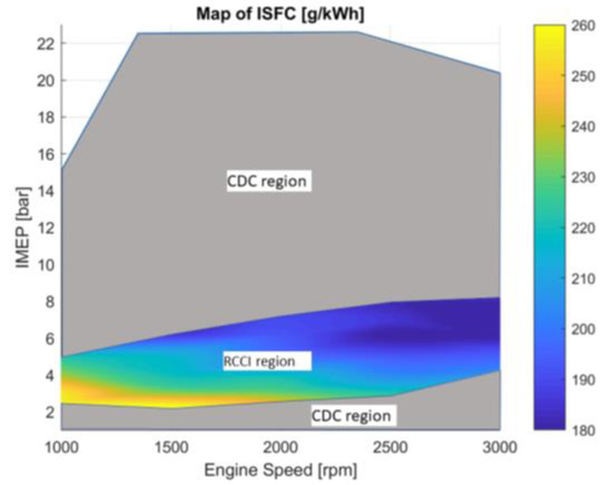 The dual-mode concept combines CDC and RCCI combustion regimes to enable operation along the whole engine map. The aim of this strategy is to promote RCCI operation whenever possible and switch to CDC to cover the engine map regions in which RCCI presents difficulties. Figure 3 illustrates the dual-mode engine map proposed by the authors in a previous work [43] in which the portions covered by both combustion regimes are differentiated and the ISFC values found for the RCCI region in the map. It can be seen that the low load-low speed region of the map leads to the worst performance, while the minimum indicated specific fuel consumption (ISFC) is achieved at 3000 rpm and 7 bar indicated mean effective pressure (IMEP), with values lower than 180 g/kWh. The influence of the engine speed on the ISFC is moderate, while the engine load has a large effect The RCCI diesel-gasoline region is covered with NOx and soot emission levels below 0.4 g/kWh and 0.01 g/kWh, respectively. The maximum load achievable with RCCI was limited by excessive MPRR (>10 bar/CAD) and/or excessive in-cylinder pressure peaks (Pmax > 160 bar). On the other hand, the lower operating region with RCCI was limited by excessive CO levels (>5000 ppm). Details regarding the dual-mode calibration procedure can be found in [31].