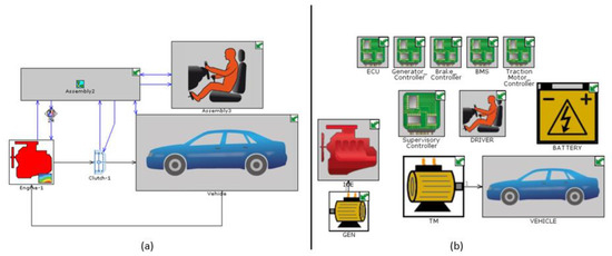 The performance of the different concepts was assessed using the commercial software GT-Power from Gamma Technologies® (v2016, Gamma Technologies, LLC., Westmont, IL, USA, 2016). The GT-Drive package allows the simulation of the whole vehicle with its subsystem such as gearbox, tires, cooling circuits, etc. In addition, the software also possesses the required devices to perform the hybridization process, resulting in different batteries (NiMh, Li-ion, etc.), motors, and controller devices. Additionally, the vehicle can be submitted to load and speed profiles, allowing assessment of its performance on different driving cycle conditions. In this way, the mapping results from bench experiments were used as inputs for the simulation. Different models were developed for each of the powertrains, and are presented in Figure 5. The main differences between the models are the increased number of controllers, the absence of a gearbox, and the addition of batteries and motors in the hybrid powertrain system (Figure 5b).