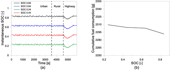 Instantaneous state of charge (SOC) (a) and final fuel consumption (b) for different initial SOC at the worldwide harmonized light vehicles test cycle (WLTC) driving cycle.