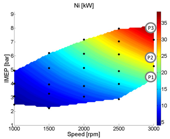 Indicated power in the RCCI portion of the map. The three selected points to perform the parametric study are marked in the map.