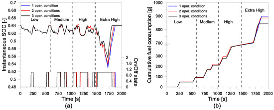 Figure 11 and Figure 12 show the instantaneous SOC and fuel consumption along the WLTC and RDE cycle, respectively, for the cases of using one, two, or three ICE operating points. Figure 11 shows slight differences for the initial phases of the driving cycle. In these conditions, the battery is mainly charged by the energy recovered through regenerative braking, while the ICE is started during only a few intervals. After 1000 s of the cycle, the SOC profiles for the three strategies become distinct as a function of the higher power requirement. However, the great differences are observed in the highway phase, where the vehicle reaches speeds higher than 100 km/h. In this case, when three operating conditions are used, it takes a short time to recharge the battery. In addition, as the number of operating conditions is increased, the SOC variation lessened compared to the case with one operating condition. Finally, it is also seen that the use of low-power operating conditions as much as possible decreases the total mass fuel consumption as its value is proportional to the power.