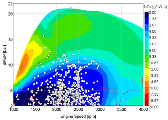 The maps obtained from experimental bench tests are used as inputs for the model. These data are specified in the engine object in Figure 5. First, geometric parameters of the engine such as total displacement, idle, engine type, etc., are specified. Following this, the maps that characterize the workings of the engine are defined. The required maps for this step are the break mean effective pressure (BMEP) values as a function of load percentage and engine speed, and the friction mean effective pressure (FMEP) maps related to the BMEP values and the engine speed, see Figure 6. With these data, the IMEP values can be obtained, and the emissions and fuel consumption maps can be converted from indicated to brake-related values. Finally, the data for emissions and fuel consumption are inserted into the model. The advantage of this calculation method is to know, a priori, the values that the parameter will possess based on a determined operating condition (BMEP and engine speed). For intermediary conditions, the experimental maps are interpolated to predict a value. This operating condition is obtained from the solution of the differential equations of vehicular motion. The total required torque to move the vehicle is defined by Equation (1) [44].