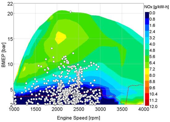 The objective of this section is to assess the potential of the RCCI-SHV architecture compared to the dual-mode concept described in Section 2.2 and conventional diesel combustion. For this purpose, performance and emissions maps of the original diesel engine and dual-mode RCCI were used as input data for the model. The driving cycles were simulated using the same gear shifting strategy for CDC and dual-mode combustion, while the hybrid concept relied on direct transmission with a fixed gear ratio. The operating conditions reached during the RDE cycle with CDC and dual-mode concepts are shown in Figure 13. It is interesting to note that the charging strategy for the hybrid vehicle was based on RBC (rule-based control), where the engine operating conditions are defined on SOC ranges. This allows for tailoring of the operating conditions to obtain the desired values of emissions. This means that the ICE will operate in a defined operating condition based on the previous state and the actual SOC value from the battery. The basic control strategy is summarized in Table 6 where CD stands for charge depleting operation and CS for charge sustaining mode. Other control strategies such as dynamic programming and a model predictive controller are able to obtain higher energy savings, but RBC has easier implementation from the control standpoint. Therefore, the energy savings achieved with the hybrid powertrain can potentially be even higher than the values presented here. Future works will be focused on the optimization of the charging strategy.