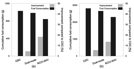 Figure 14 presents the results obtained for the cumulative fuel consumption and the respective fuel saving for each combustion mode. In the dual-mode case, most of the operating conditions fall inside the RCCI zone, which leads to a fuel consumption improvement of almost 5% compared to CDC. This is possible because the RCCI zone has lower values of brake-specific fuel consumption (BSFC) than CDC due to the highly diluted and fast combustion process. The RCCI-SHV strategy results in higher fuel savings since all the charging operating conditions come from the RCCI zone. In addition, the three points selected allow the ICE to run the engine in optimized conditions, overcoming the drawbacks associated with regular powertrains. The comparison with the CDC mode shows an energy saving of almost 19%. The reduction in the energy consumption is also higher compared to the dual-mode case, reaching absolute values of around 13%. Thus, despite the fact that the charging strategy is not optimal, the hybrid vehicle was able to reach considerable fuel savings compared to both RCCI and CDC operations. The values obtained for the RDE driving cycle are presented in Figure 14b. Since the RDE cycle is longer than the WLTC, the effect of the RCCI zone is observed. This is directly translated in a higher fuel saving compared to the CDC case, reaching values around 6%. Nonetheless, the same cannot be observed for the hybrid powertrain. The increased number of starts of the engine during the cycle leads to an increase in the total fuel consumption since a fuel penalty constraint was used to assess the higher fuel consumption upon starting the engine. Therefore, the final fuel saving reached 13.4%, an absolute decrease of almost 5% compared to the WLTC cycle.
