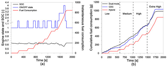 The SOC variation during the cycle has a notable importance on the hybrid concept performance. The SOC value at the end of the cycle must reach the initial SOC to consistently deliver the same amount of energy for the driver upon each use of the car. For this study, an initial SOC value of 0.64 was used, and its behavior during the driving cycle is presented in Figure 15. It can be seen that the initial and the final values are the same. Whenever SOC reaches the lower limit, the engine starts and remains running during the time required to achieve the SOC upper limit, as illustrated by the blue line. The steady operation in a single condition defines an increasing step in the fuel consumption profile. On Figure 15b, the cumulative fuel consumption profiles during the WLTC cycle for the three modes are presented. It can be seen that the extra high phase is responsible for almost 50% of the total fuel consumption of the vehicle. In this sense, as the cycle progresses, the ICE starts to operate more frequently and at high load conditions to maintain the charge level. This can be visualized by looking at the engine state number in Figure 15a, as 1 stands for charge depleting and 4 for the higher power density condition. As a result, the extra high phase exerts a dominance on the final fuel consumption. Figure 16 shows the results of the RDE cycle. It is clear that the engine starts more frequently during this driving cycle than with the WLTC. This is directly related to the velocity profiles that were presented in Figure 7. The RDE cycle has higher velocities than the WLTC during the initial phases. Therefore, the energy requirements are also higher, making it necessary for the ICE to work. However, at the final phase of RDE, the state 4 is not achieved, i.e., the higher load condition is not required to charge the batteries. This is explained by the maximum velocity achieved during the driving cycle. While the WLTC cycle reaches maximum velocities of 130 km/h, the RDE remains under 120 km/h for the duration of the cycle. Therefore, low power density conditions are enough to maintain the charge or to drive the battery energy to its original condition.